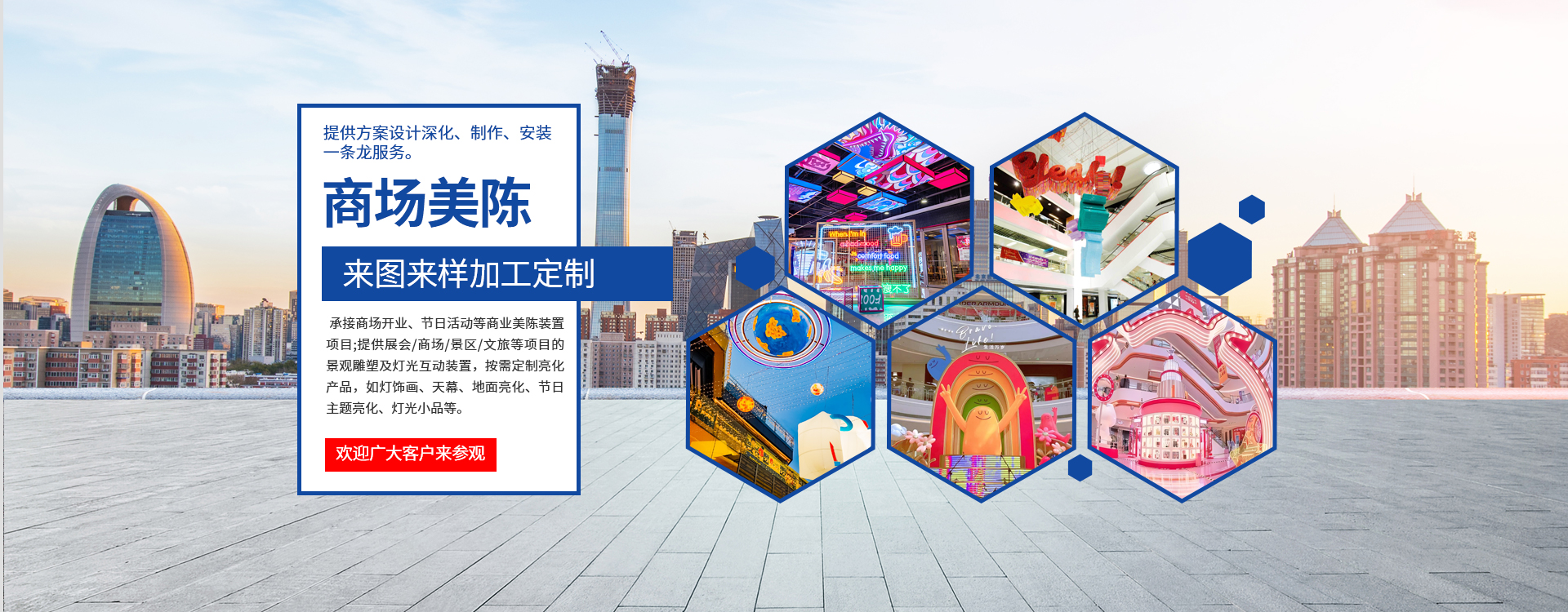 承接商場開業、節日活動等商業美陳裝置項目;提供展會/商場/景區/文旅等項目的景觀雕塑及燈光互動裝置,按需定制亮化產品,如燈飾畫、天幕、地面亮化、節日主題亮化、燈光小品等。